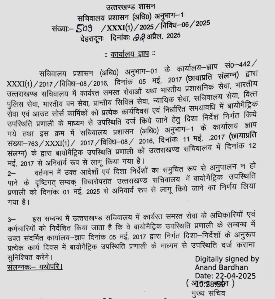 Biometric attendance made compulsory in Uttarakhand Secretariat, Chief Secretary issued orders April 22, 2025 No Comments Read More »
